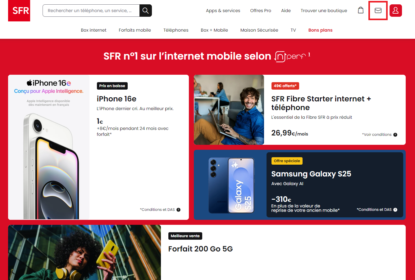 • Lancez votre navigateur Internet habituel et rendez-vous sur le site www.sfr.fr, puis cliquez sur l’icône Enveloppe, en haut de l’écran.